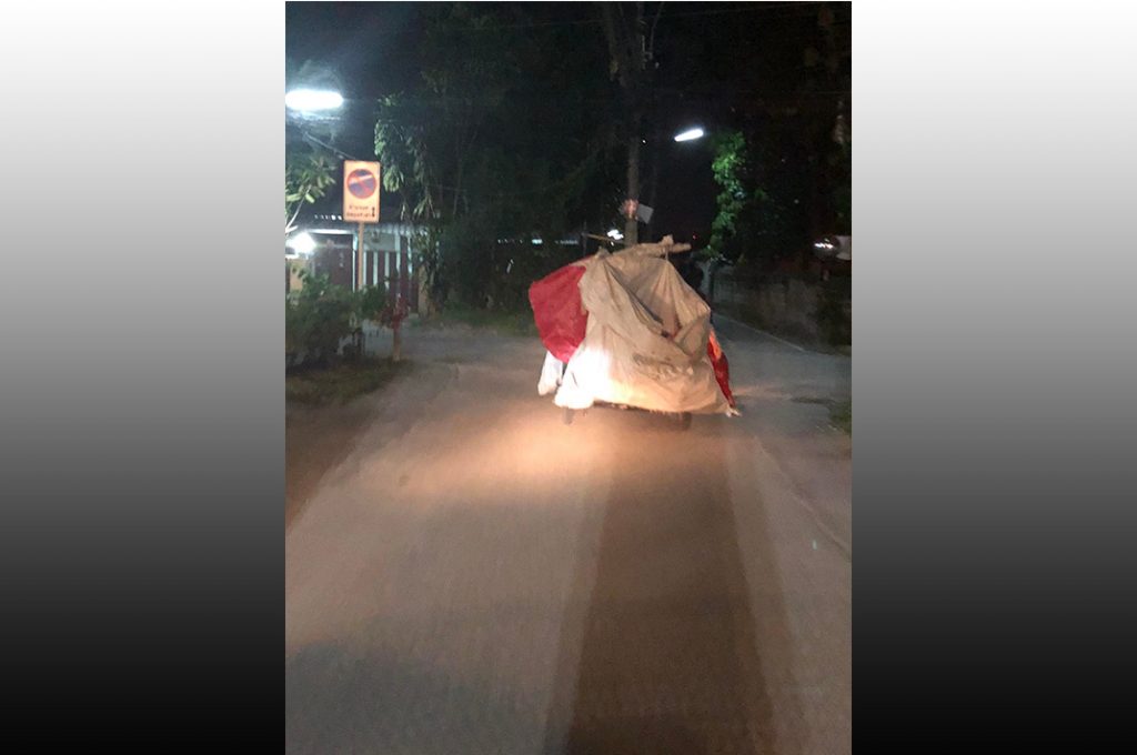 ညနေ မှောင်ရီပျိုးစချိန်မှာတော့ မြန်မာလုပ်သားတွေဟာ ဆိုင်ကယ်ဘေးတွဲမှာ ဆာလာအိတ်တွေကို အစီအရီချိတ်ပြီး ချင်းမိုင်မြို့ထဲကို ဦးတည်ကာ ချီတက်ထွက်ခွာခဲ့ကြပါတယ်။