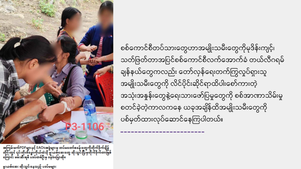 “တောထဲတွင် အခက်အခဲများကြောင့် နေထိုင်လိုစိတ်မရှိပဲထွက်ပြေးနေတဲ့ PDF အမျိုးသမီးတွေကို အကြမ်းဖက် PDF တွေက ပြန်လည်ဖမ်းဆီးခြင်းတွေပြုလုပ်လျက်ရှိပြီး စစ်မတိုက်ချင်ရင် အစထဲက မလာနဲ့ တောထဲရောက်ရင် စစ်တိုက်ရမယ်။ စစ်မတိုက်ချင်ရင် “နို့”လိုက်တိုက်ရမယ်လို့ ခြိမ်းခြောက်လျက်ရှိ” ဆိုတဲ့စာတွေ ရေးသားကြပါတယ်