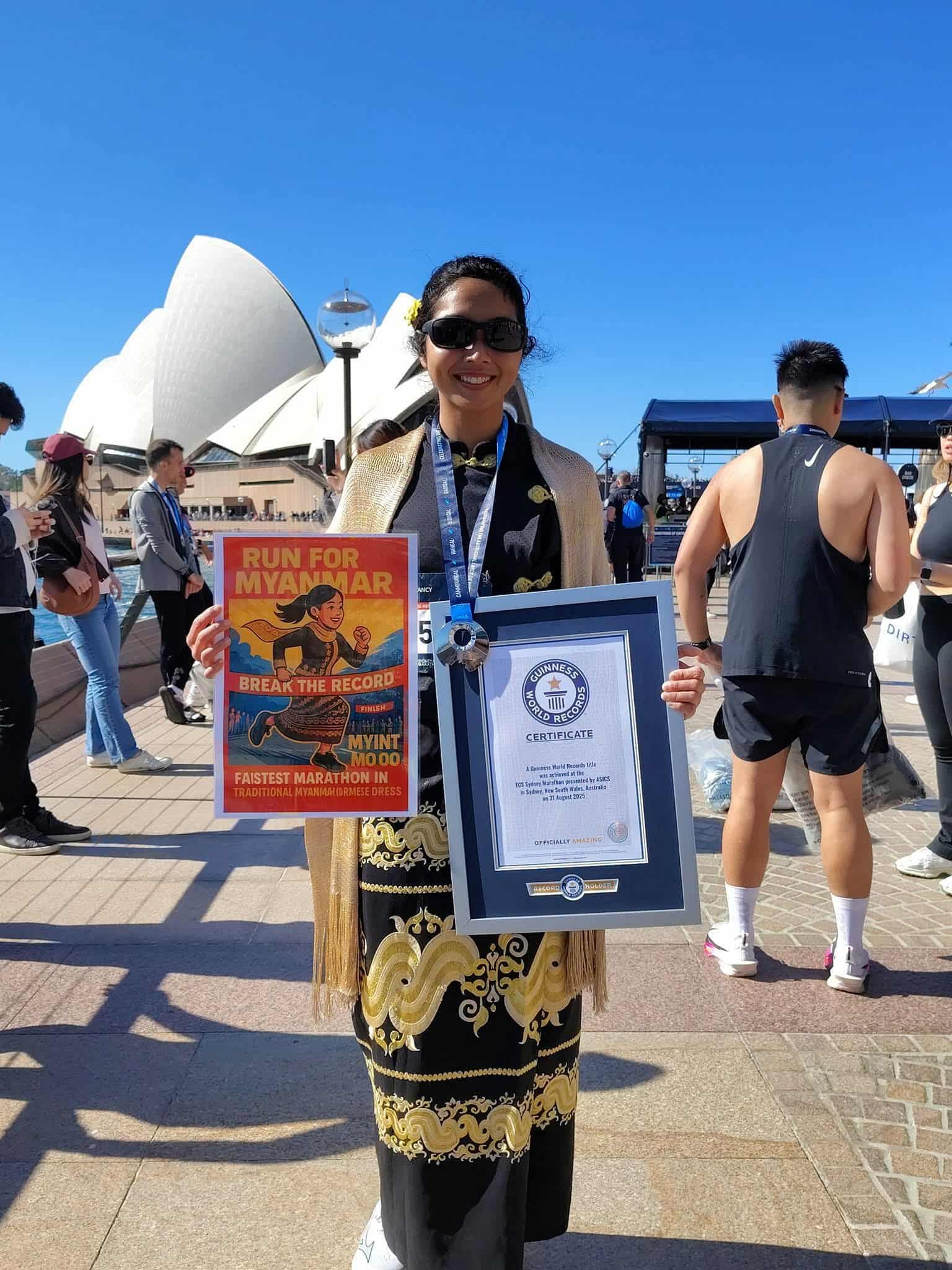 အခုလည်း သူဟာ သြဂုတ်လ ၃၀ ရက် ဩစတြေးလျနိုင်ငံ၊ ဆစ်ဒနီမြို့မှာပြုလုပ်တဲ့ (Sydney Marathon 2025) ပြိုင်ပွဲမှာ မြန်မာဝတ်စုံ ထမီနဲ့ ရင်ဖုံးအကျီဝတ်ကာ နိုင်ငံတကာက အပြေးသမား သုံးသောင်းခွဲကျော်နဲ့အတူ ပါဝင်ယှဉ်ပြိုင်ပြီး ဂင်းနစ် ကမ္ဘာ့စံချိန် မှတ်တမ်းသစ်ရေးထိုးနိုင်ခဲ့တဲ့အမျိုးသမီးတစ်ယောက်ပါ။