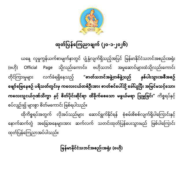 မြန်မာနိုင်ငံ သဘင်အစည်းအရုံး(ဗဟို)က လူမှုကွန်ယက်မှာပျံ့နှံ့လာတဲ့ ဇာတ်သဘင်အဖွဲ့တဖွဲ့ရဲ့ နှစ်ပါးသွား အစီအစဉ် ဖျော်ဖြေနေတုန်း၊ ပရိတ်သတ်အတွင်းက ကလေးငယ်တဦးကို ဇာတ်စင်ပေါ် ခေါ်ယူပြီး ကလေးငယ် ဂုဏ်သိက္ခာနှင့် စိတ်ပိုင်းဆိုင်ရာ ထိခိုက်စေတဲ့ အမြင်မသင့်တော်တဲ့ မဖွယ်မရာပြုမှုတယ်ဆိုတဲ့ တိုင်ကြားစာတွေ လက်ခံရရှိတဲ့အတွက် ဒီကိစ္စရပ်ကို စုံစမ်းစစ်ဆေးလျက်ရှိတယ်လို့ မနေ့က နေ့စွဲနဲ့ ထုတ်ပြန်ပါတယ်။
