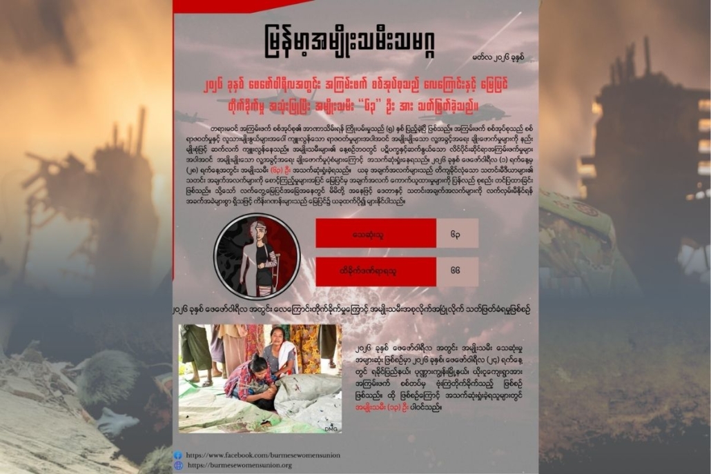 မြန်မာ့အမျိုးသမီးသမဂ္ဂက သတင်းမီဒီယာတွေမှာ စောင့်ကြည့် လေ့လာမှုအရ ပြီးခဲ့တဲ့ ၂၀၂၅ ဇန်နဝါရီ ကနေ ဒီဇင်ဘာ ၃၁ ရက်အထိ ၁ နှစ်တာအတွင်း စစ်အုပ်စုရဲ့ လေကြောင်းနဲ့မြေပြင်တိုက်ခိုက်မှုတွေ ကြောင့် အမျိုးသမီး ၇၉၂ ဦး သေဆုံးကာ အမျိုးသမီး ၈၁၅ ဦး ထိခိုက်ဒဏ်ရာရခဲ့တယ်လို့ ထုတ်ပြန်ထားပါတယ်။
